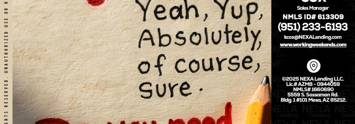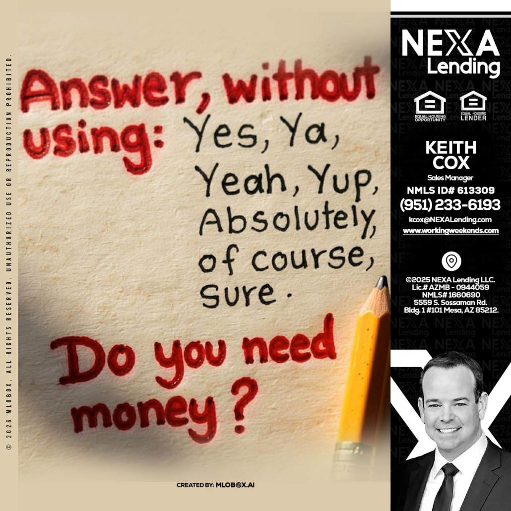 answer without - Keith Cox -Sales ManagerHi, my name is Keith Cox. I’m a Loan Officer with NEXA Lending LLC., offering personalized mortgage solutions, fast customized quotes, great rates and service with integrity.