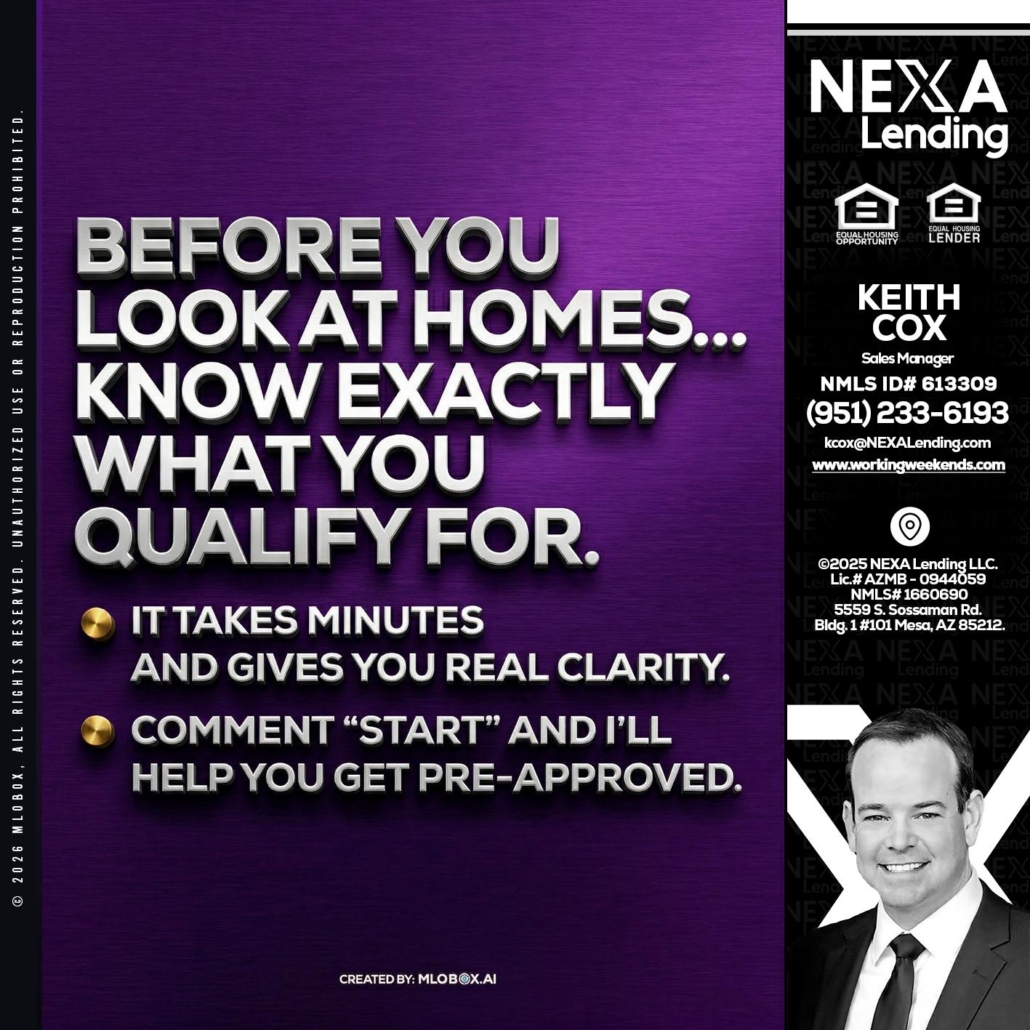 BEFORE YOU - Keith Cox -Sales ManagerHi, my name is Keith Cox. I’m a Loan Officer with NEXA Lending LLC., offering personalized mortgage solutions, fast customized quotes, great rates and service with integrity.