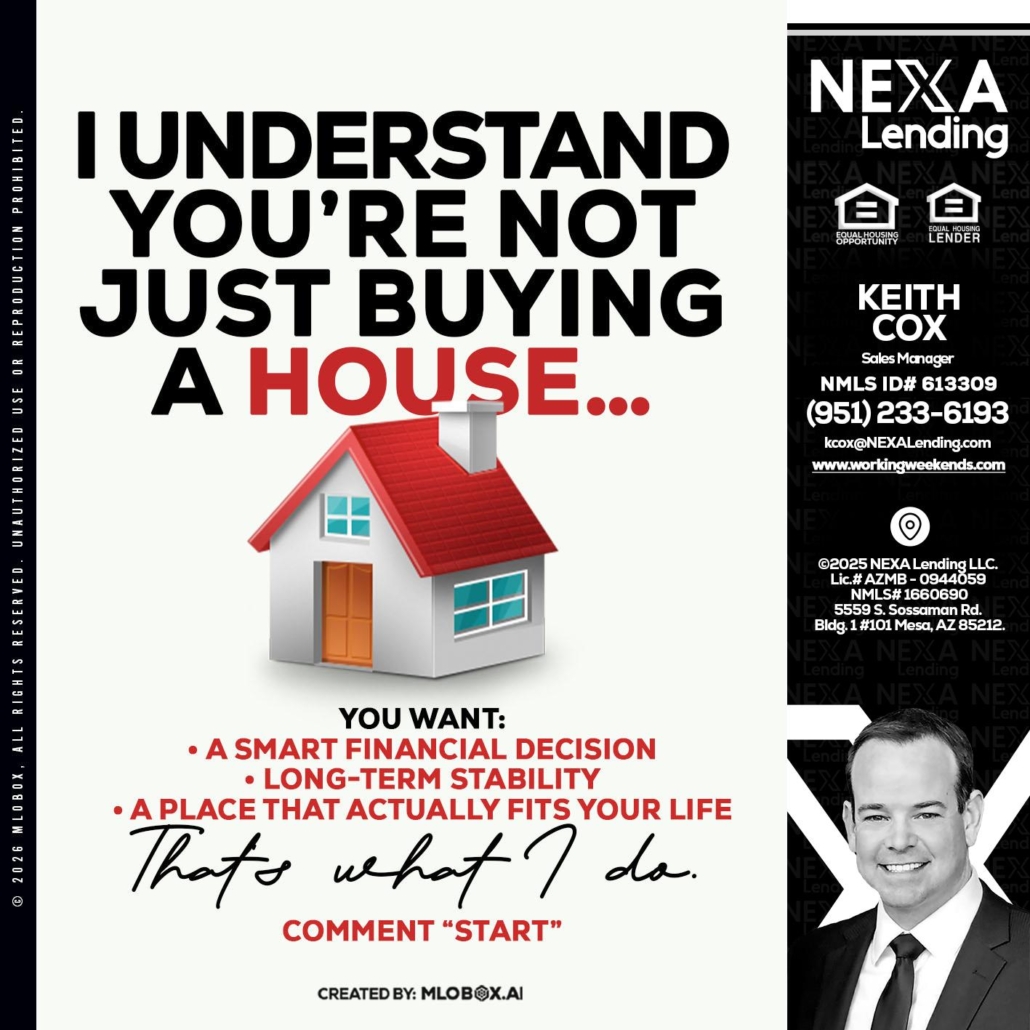 Hi, my name is Keith Cox. I’m a Loan Officer with NEXA Lending LLC., offering personalized mortgage solutions, fast customized quotes, great rates and service with integrity.