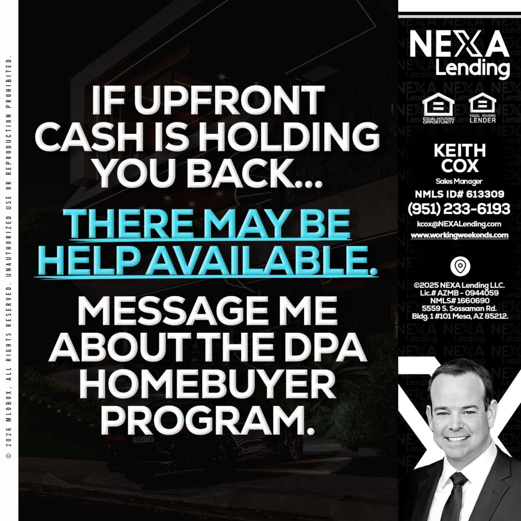 IF UPFRONT - Keith Cox -Sales ManagerHi, my name is Keith Cox. I’m a Loan Officer with NEXA Lending LLC., offering personalized mortgage solutions, fast customized quotes, great rates and service with integrity.