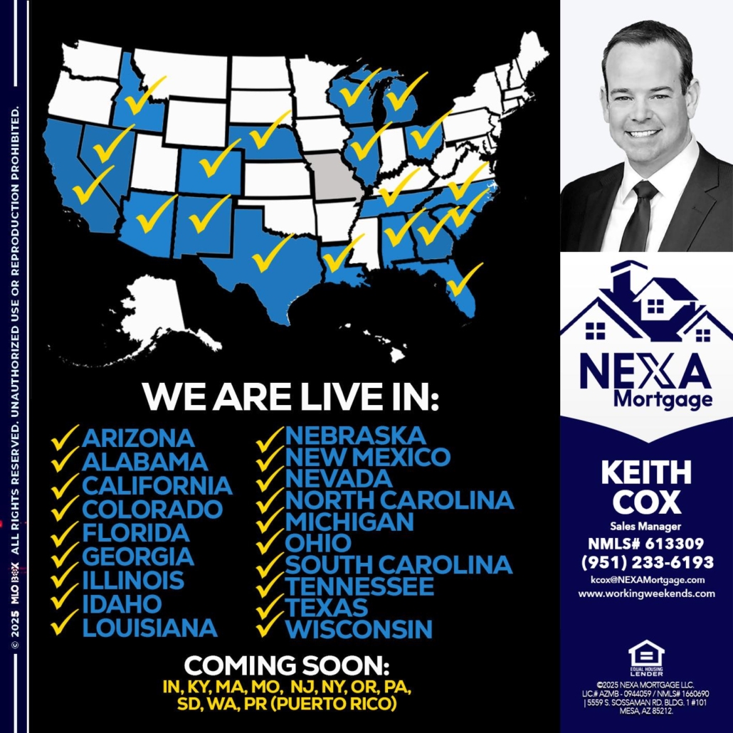 Hi, my name is Keith Cox. I’m a Loan Officer with NEXA Mortgage LLC., offering personalized mortgage solutions, fast customized quotes, great rates and service with integrity.