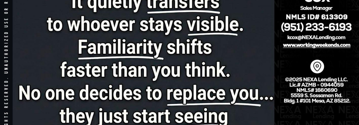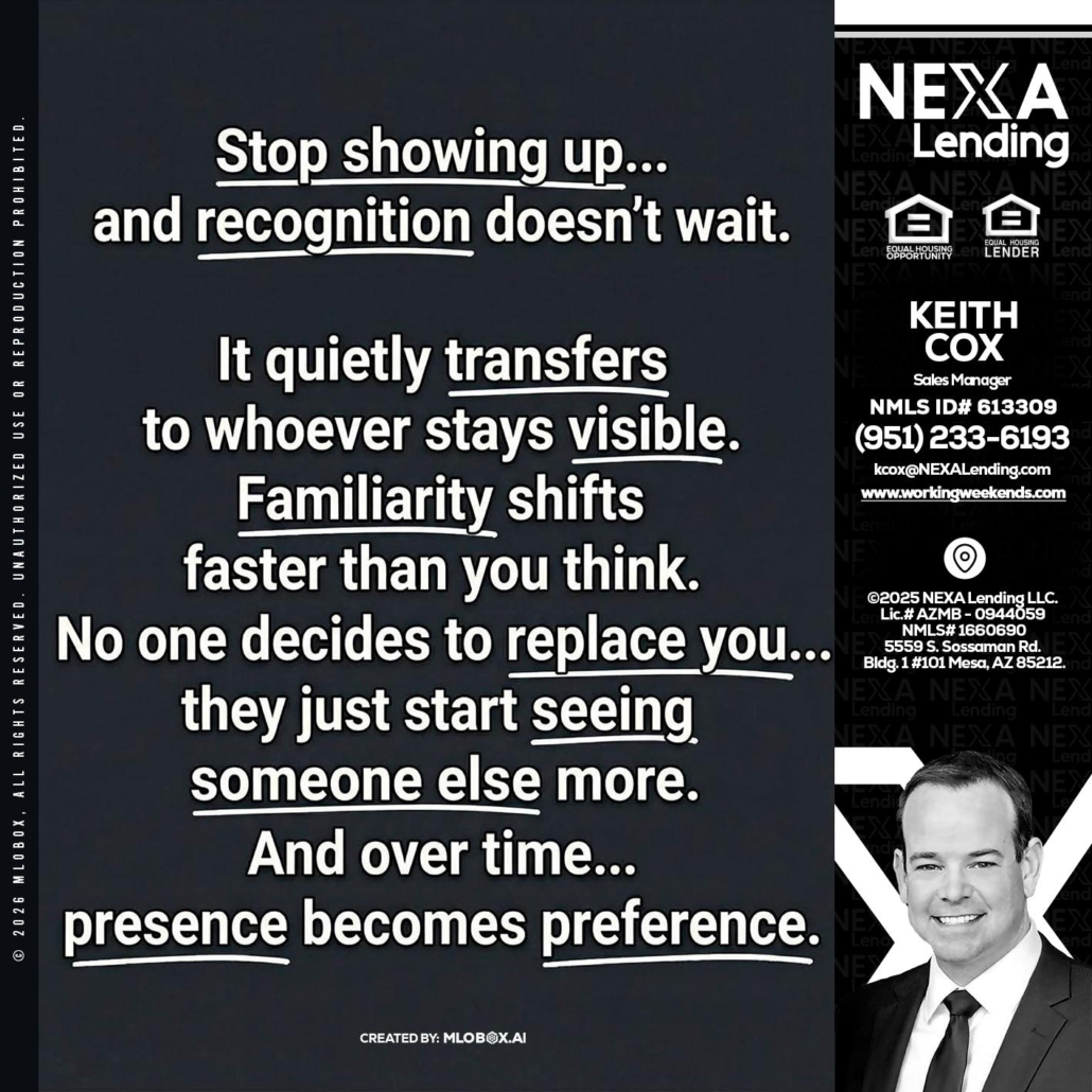 STOP SHOWING - Keith Cox -Sales ManagerHi, my name is Keith Cox. I’m a Loan Officer with NEXA Lending LLC., offering personalized mortgage solutions, fast customized quotes, great rates and service with integrity.
