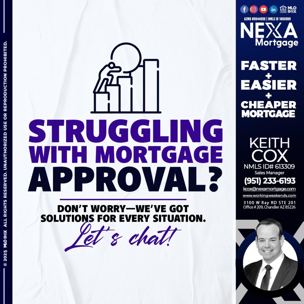 Hi, my name is Keith Cox. I’m a Loan Officer with NEXA Mortgage LLC., offering personalized mortgage solutions, fast customized quotes, great rates and service with integrity.