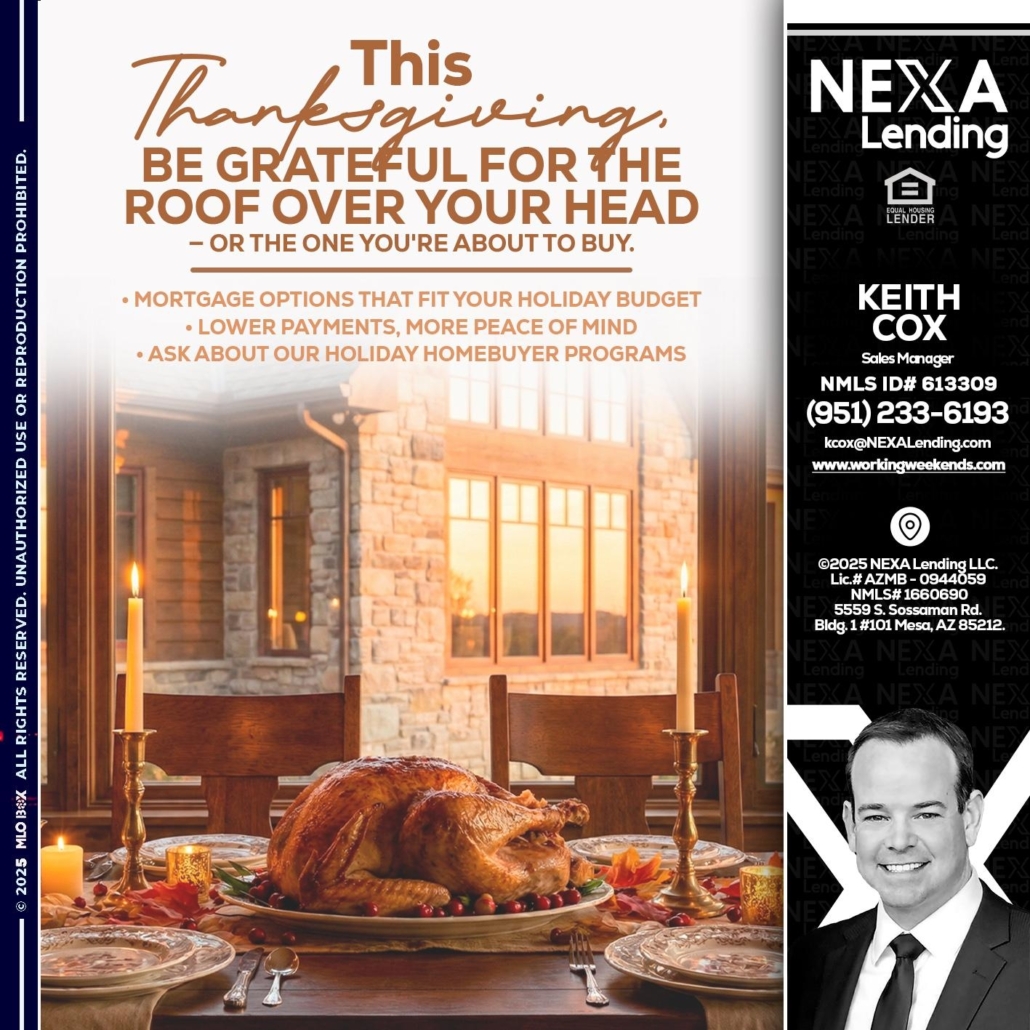 Hi, my name is Keith Cox. I’m a Loan Officer with NEXA Mortgage LLC., offering personalized mortgage solutions, fast customized quotes, great rates and service with integrity.