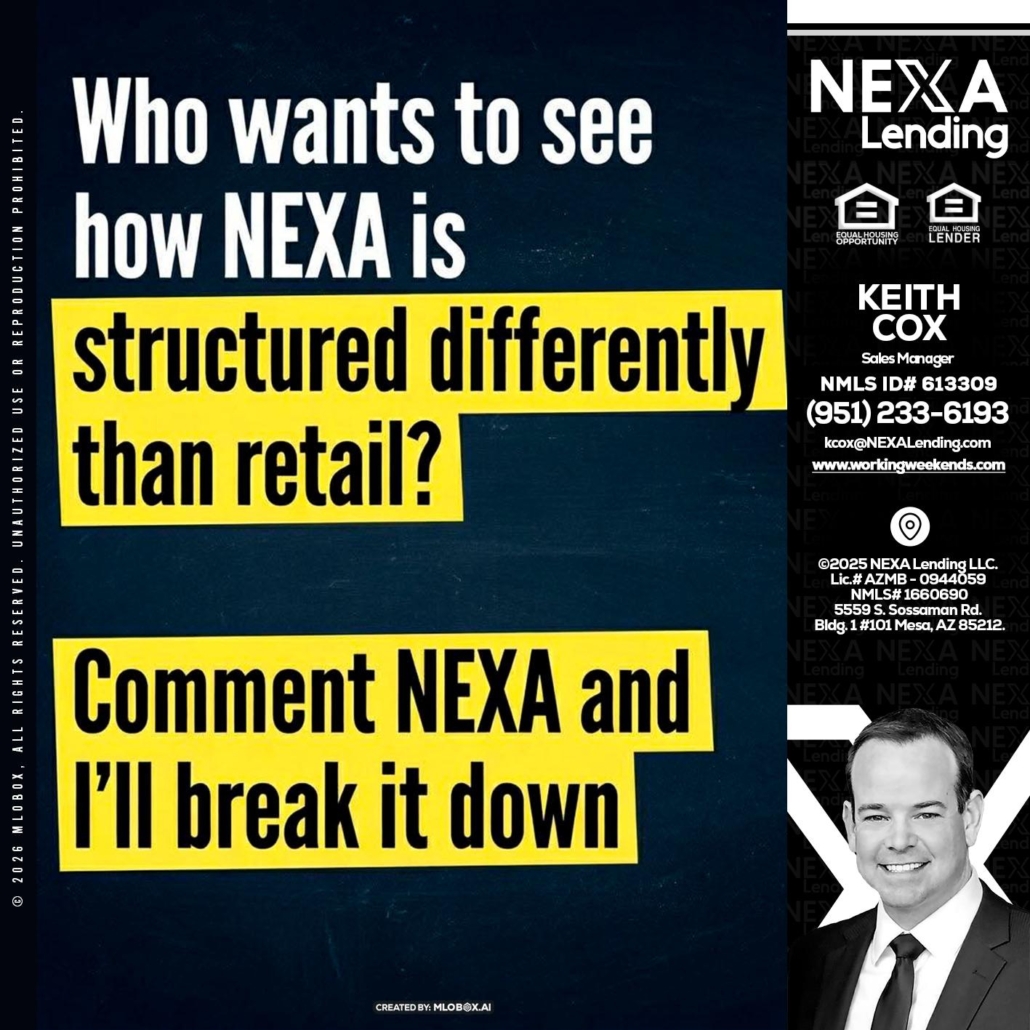 who want to see - Keith Cox -Sales ManagerHi, my name is Keith Cox. I’m a Loan Officer with NEXA Lending LLC., offering personalized mortgage solutions, fast customized quotes, great rates and service with integrity.